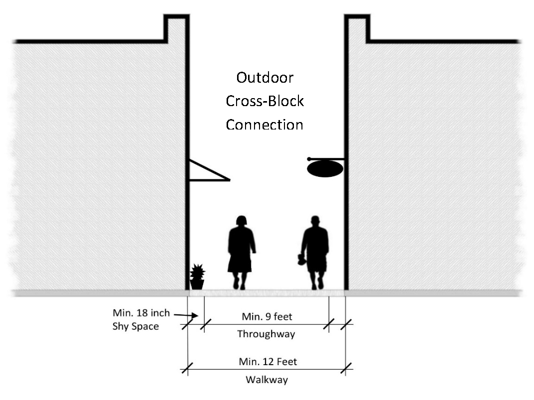 Design. Outdoor cross-block connections shall be at least 12 feet in width (total), which includes: (See following illustration)