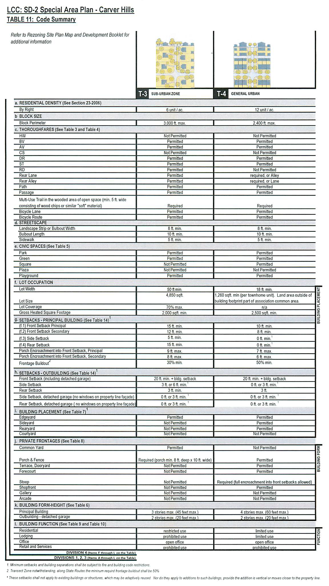 Division 5. Table 11: Code Summary, as presented in The Carver Hills Development Booklet. Applicant may seek administrative approval of a reduction in the front yard (principal and secondary) setback in the T-4 sub-district, subject to approval of the Community Development Director, due to unforeseen setback constraints pertaining to roadway radii.
