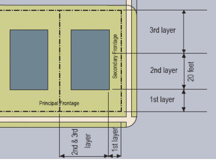 Driveways widths in the First Layer: shall be limited to a maximum of 20 feet for the length of the driveway located between the front porch and the street curb for single-family homes, and the front building facade and the street for the townhomes.