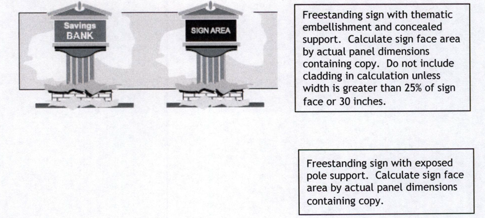 Front façade with linear dimensions and calculation of sign size.