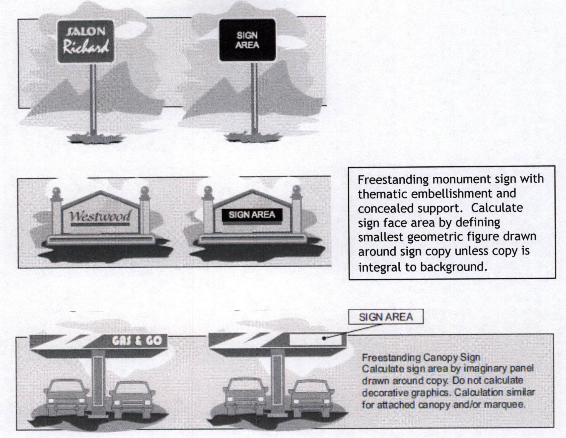 Computation of the total sign area, the area of each individual sign, the height of signs, and an outline of the building façades for which signs will be mounted. This shall include all signs permitted for the applicable district and any additional signage area requested through the MSP.