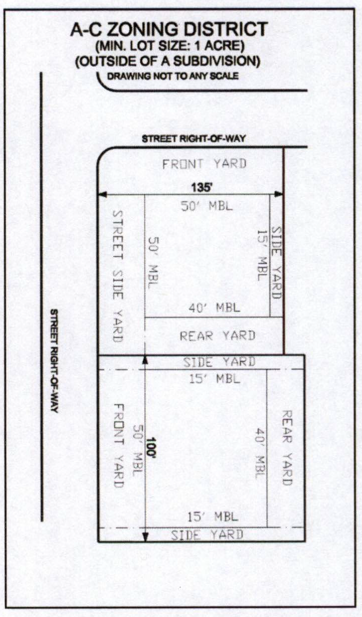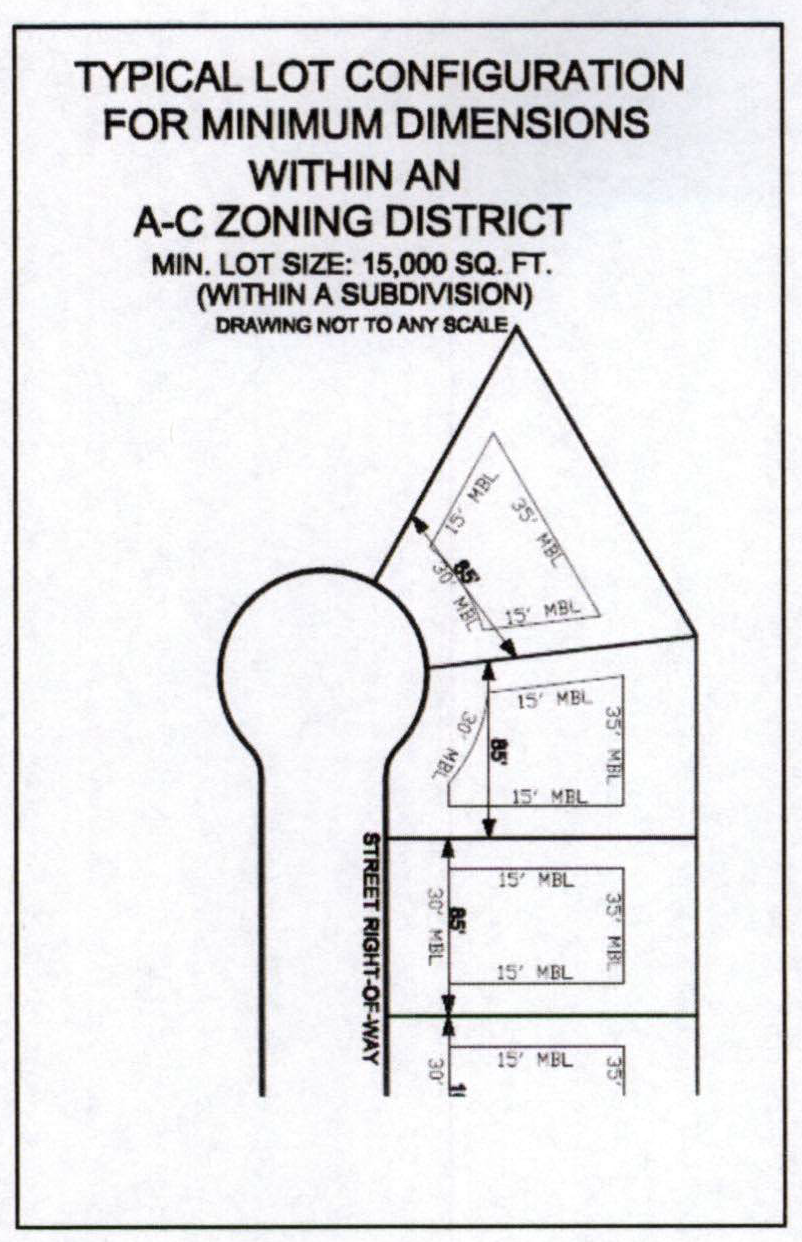 Agricultural-conservation (A-C) district. Regulations for the agricultural district are intended to provide for development on land situated in urban areas that is intended primarily for agricultural uses. Very low density residential uses are also permitted. District dimensional regulations require a minimum of one acre lots for site-built, stand-alone residential uses in this district. Structures not built in a subdivision must comply with the dimensional requirements outlined in the Table of District Dimensional Regulations (article VIII, section 114-132). However, if located in an approved subdivision, lot sizes shall be a minimum of 15,000 square feet and shall comply with R-1 district dimensional regulations other than lot size.