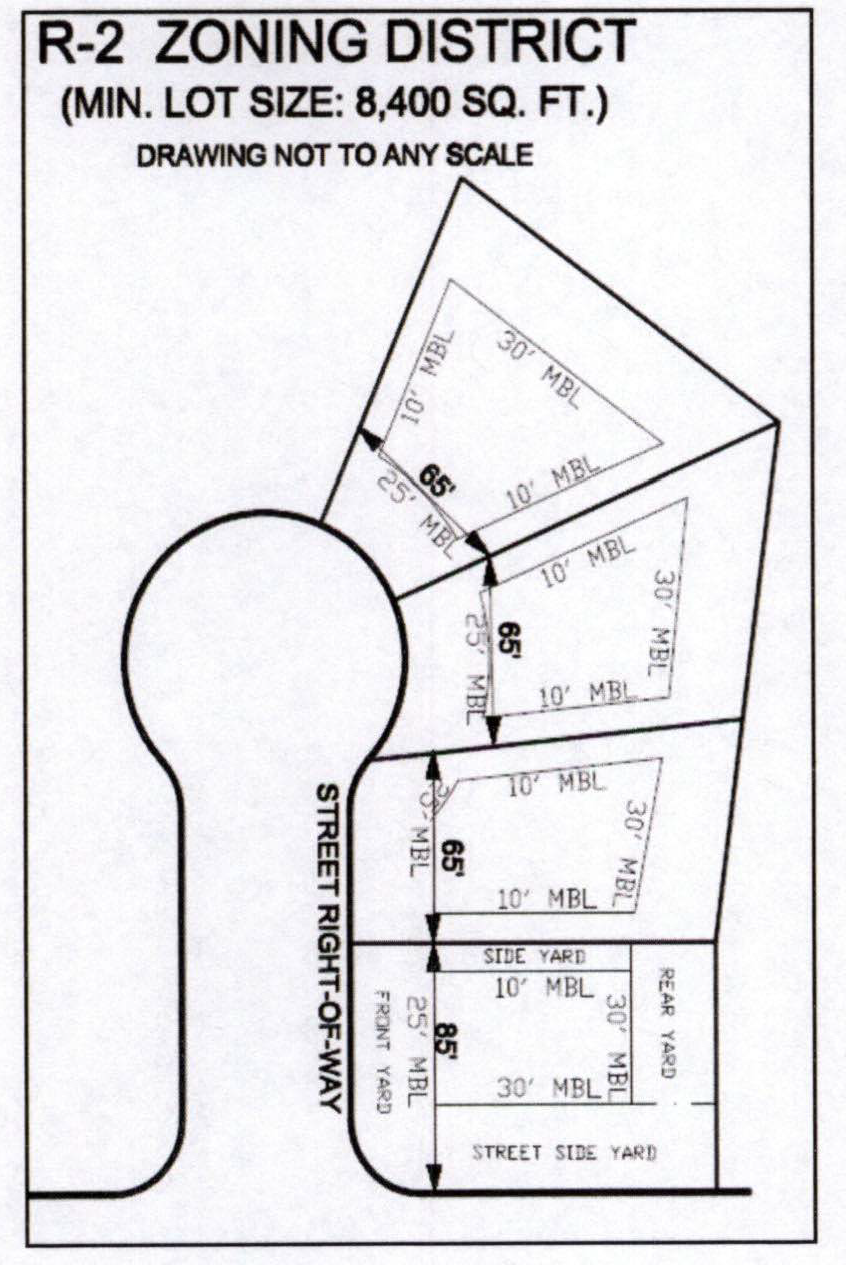 R-2, Residential single-family, medium density. This district is intended to provide for medium density urban residential development, containing single-family dwellings along with related recreational facilities protected from intrusion of commercial and industrial activity. Lots sizes in R-2 districts range from 8,400 square feet to 11,999 square feet.