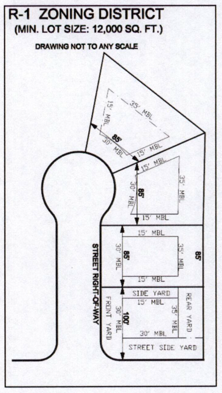 R-1, Residential single-family, low density. This district is intended to provide for low density urban residential development, which is designed to provide quiet, low density areas for single-family living with related recreational facilities protected from intrusion of non-residential activity. Lot sizes in R-1 districts are 12,000 square feet or greater.