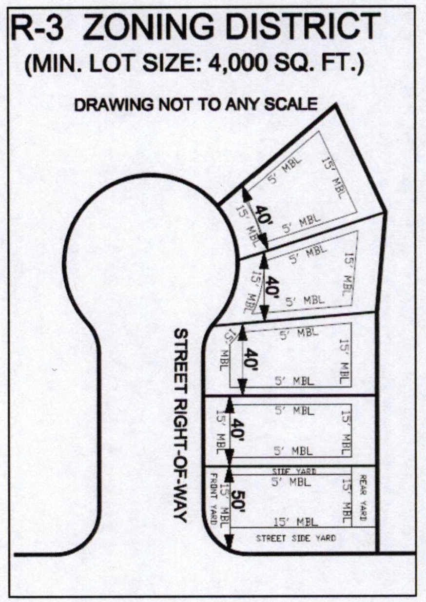 R-3, Residential single-family, high density. This district is intended to provide for high density urban residential development, containing single-family dwellings along with related recreational facilities protected from intrusion of non-residential activity. Lots sizes in R-3 districts range from 4,000 square feet to 8,399 square feet.