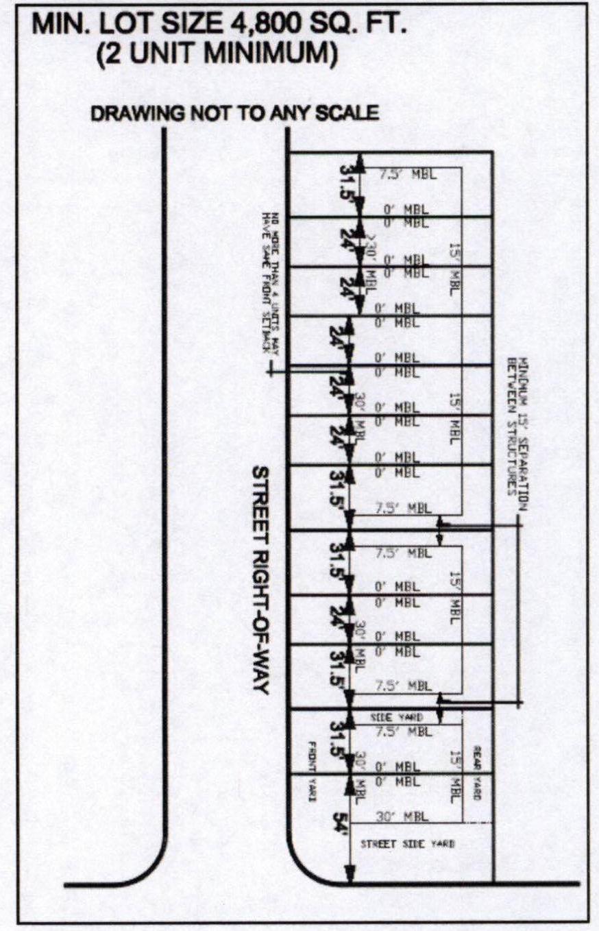 R-4, Residential, attached multi-family, 2-7 dwelling units, high density. This district is intended to provide for high density urban residential development, containing at least two attached dwelling units but not more than seven attached dwelling units, along with related recreational facilities protected from the intrusion of non-residential activity. Single-family dwellings are permitted in R-4 districts utilizing R-3 dimensional regulations as part of the overall mix of housing uses but not independently. Lot sizes in R-4 districts range from 4,800 square feet to 16,800 square feet, but lots can be larger if so desired. The chart below illustrates the minimum and maximum number of dwelling units as well as the minimum lot area for developments in R-4 district. When approved by the building official and the planning commission, zero lot lines are permitted along common walls of attached dwelling units. However, a minimum separation is required between all unattached buildings and/or structures; see the Table of District Dimensional Regulations for standards. This definition is intended to include townhouses as modified by this chapter.