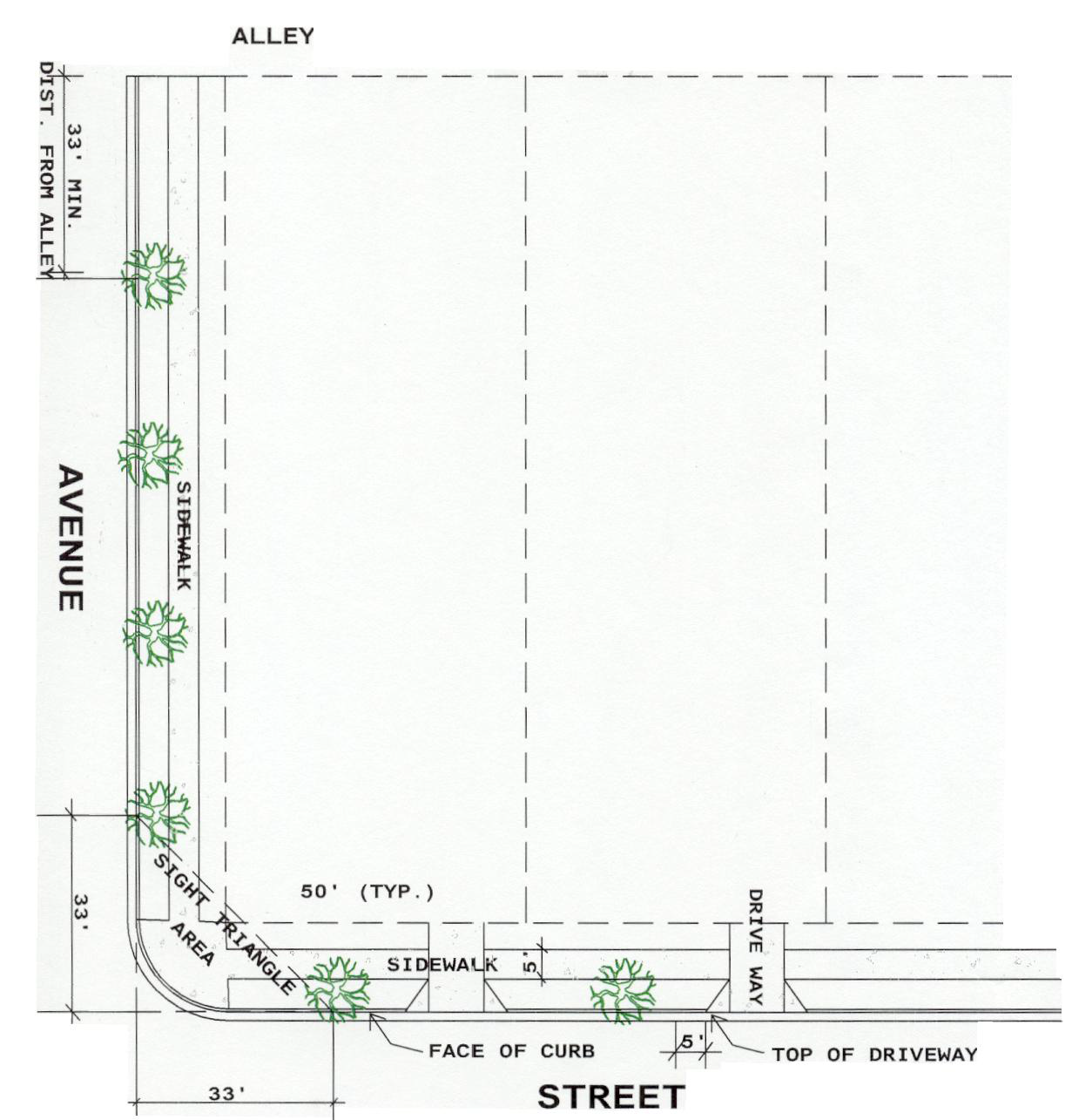 Trees planted closer than thirty-three (33) feet from the curb line of any intersection of streets or alleys shall comply with Section 1802, Traffic Sight Line Requirements.