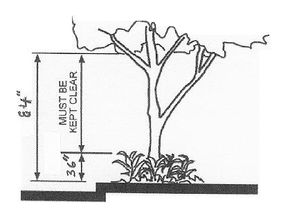 Trees at Intersections. All trees shall be trimmed and kept trimmed so that there shall be no limbs, leaves, needles or other foliage above thirty-six (36) inches or below eighty-four (84) inches (measured from top of existing or future street curb) within the sight triangle area. See Figure 2 and 3.
