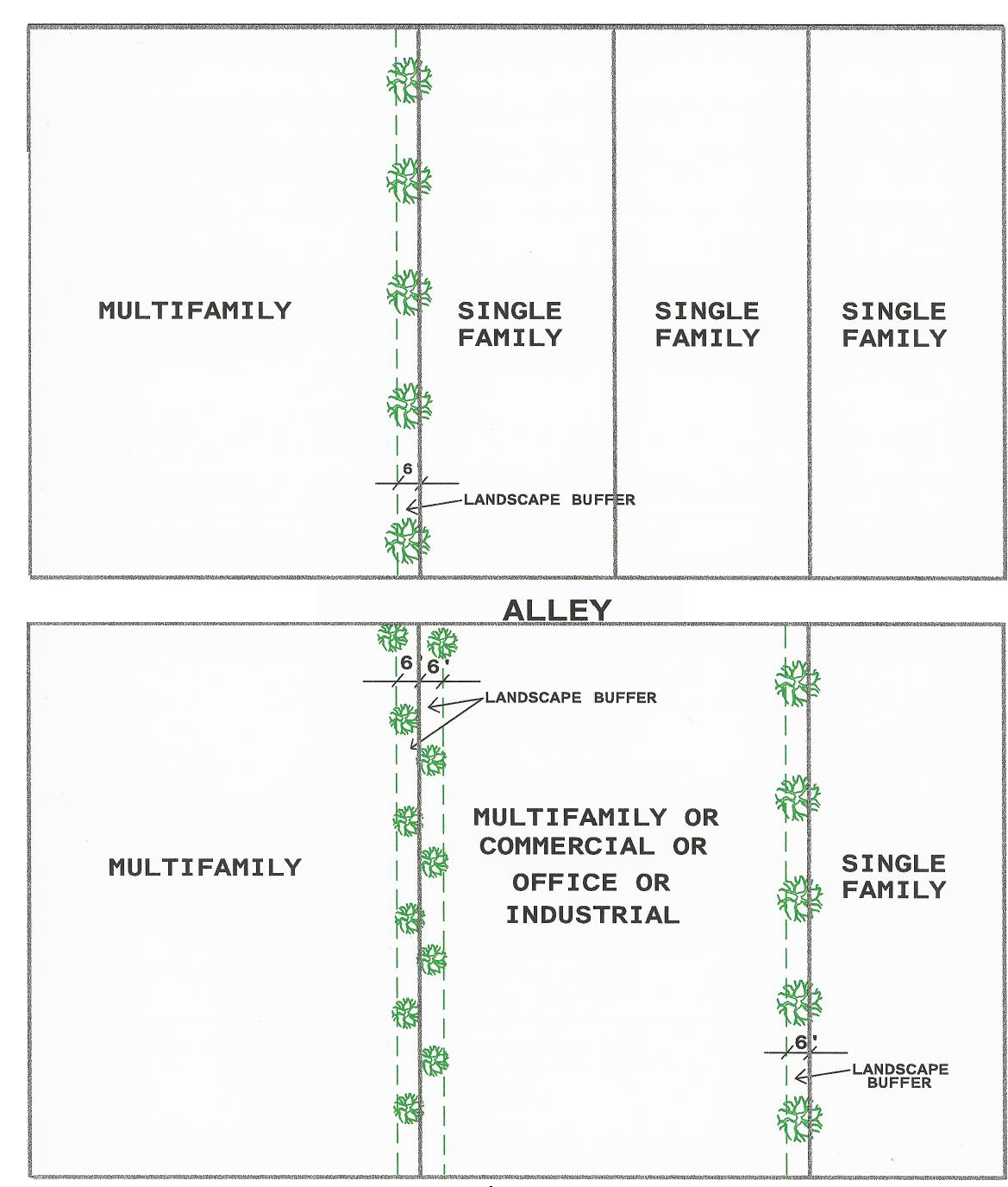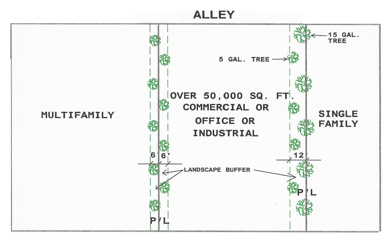 A minimum size of five-gallon trees spaced as described in Section 1801.2 shall be planted along any property line of parcels developed for multifamily, commercial, office, or industrial uses which are adjacent to a single family residential or multifamily residential development. Minimum width of landscape buffer shall be six (6) feet. See Figure 4.