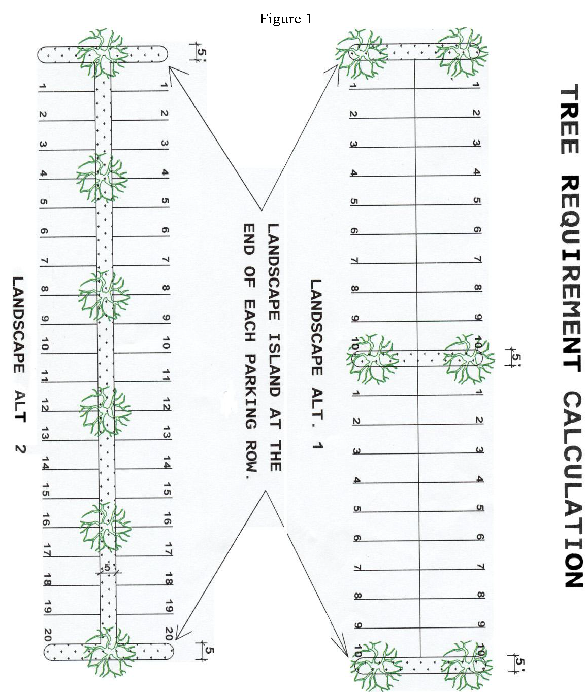 Landscaping Requirements. All parking areas requiring more than fifteen (15) parking spaces shall be landscaped in accordance with Figure 1 below in accordance with alternative 1 or 2: