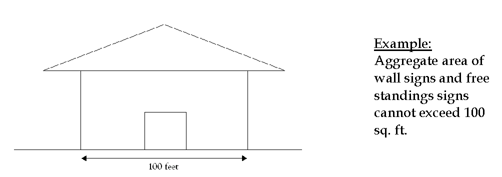 Area: The maximum permitted area of a wall sign or wall signs shall not exceed one (1) square foot for each one (1) linear foot of primary building frontage or one (1) square foot for each five (5) feet of primary lot frontage; with the aggregate area of any wall signs plus any free-standing sign not to exceed the total obtained by one (1) square foot per one (1) linear square foot.