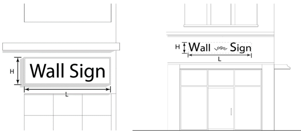 Wall sign: A sign that is fastened directly to or is placed or painted directly upon the exterior wall of a building, with the sign face parallel to the wall, and extending from the surface of the wall no more than four inches.