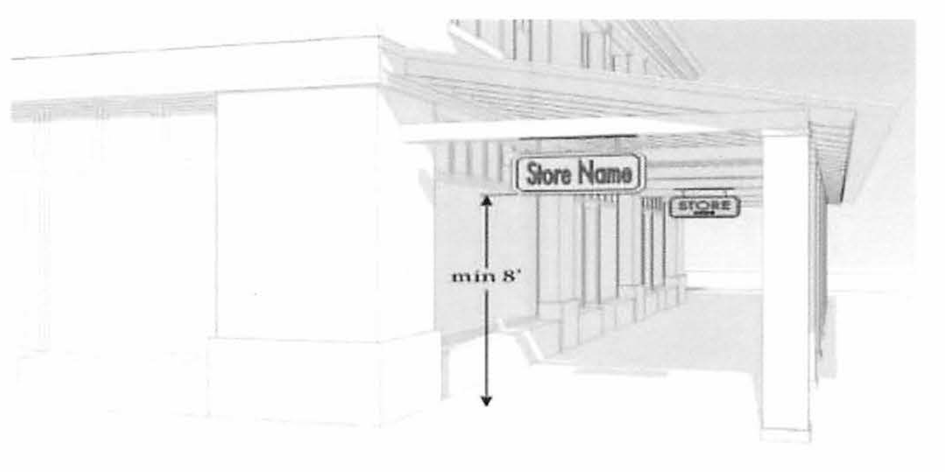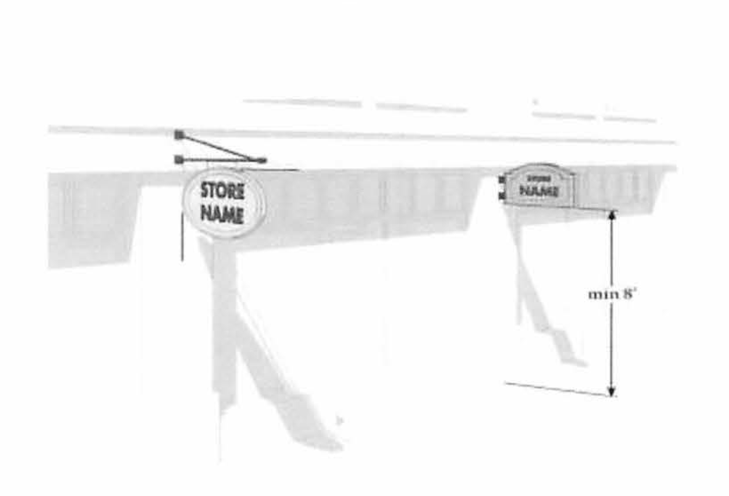 Under-canopy sign: A display attached to the underside of a marquee or canopy and protruding over public or private sidewalks.