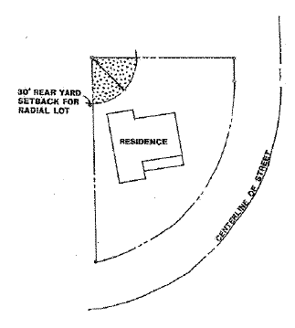 Radial lot: A lot which fronts on an interior arch of a curve which results in the lot having only three sides and which does not have a clearly identifiable rear lot line. The minimum rear yard setback area shall be defined by the arch of a circle whose radius is equal to the minimum required rear yard setback and which is measured from the point at which the two side lot lines intersect and which is further illustrated as follows: