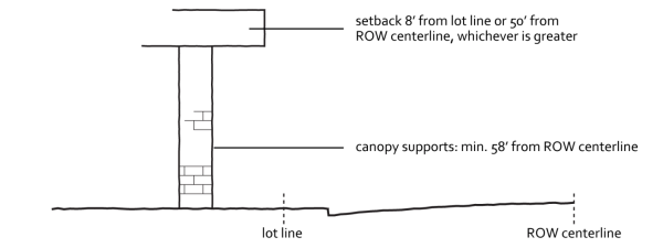 [2] Or eight feet (8') from lot line, whichever provides the greater setback. Vertical canopy supports subject to fifty-eight foot (58') minimum setback from ROW centerline. See Figure 3-2.