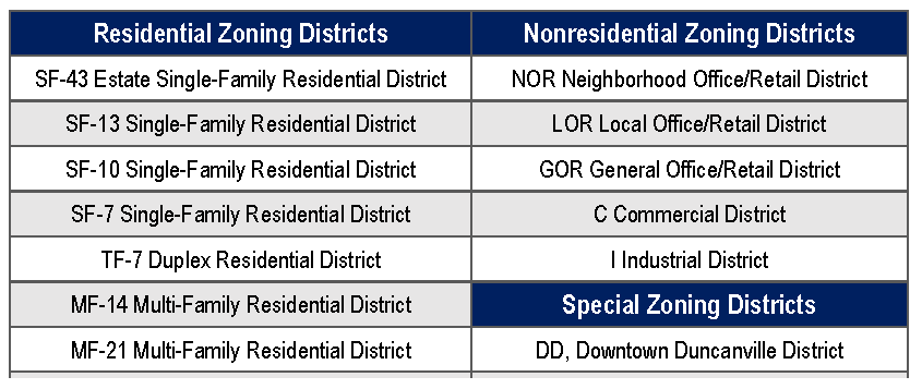 Zoning districts established. The City of Duncanville is hereby divided into zoning districts. The use, height, and area regulations are uniform within each district. All land within the city limits shall be classified into one of the zoning districts listed in Table 2.01.1. Zoning Districts.