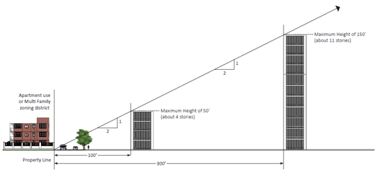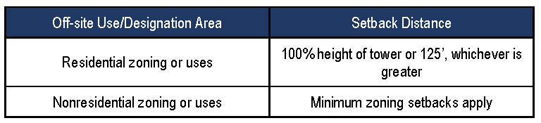 The setback distance between the proposed antenna and the nearest residential unit and/or residentially zoned properties shall be in accordance with D.3. Setbacks above.
