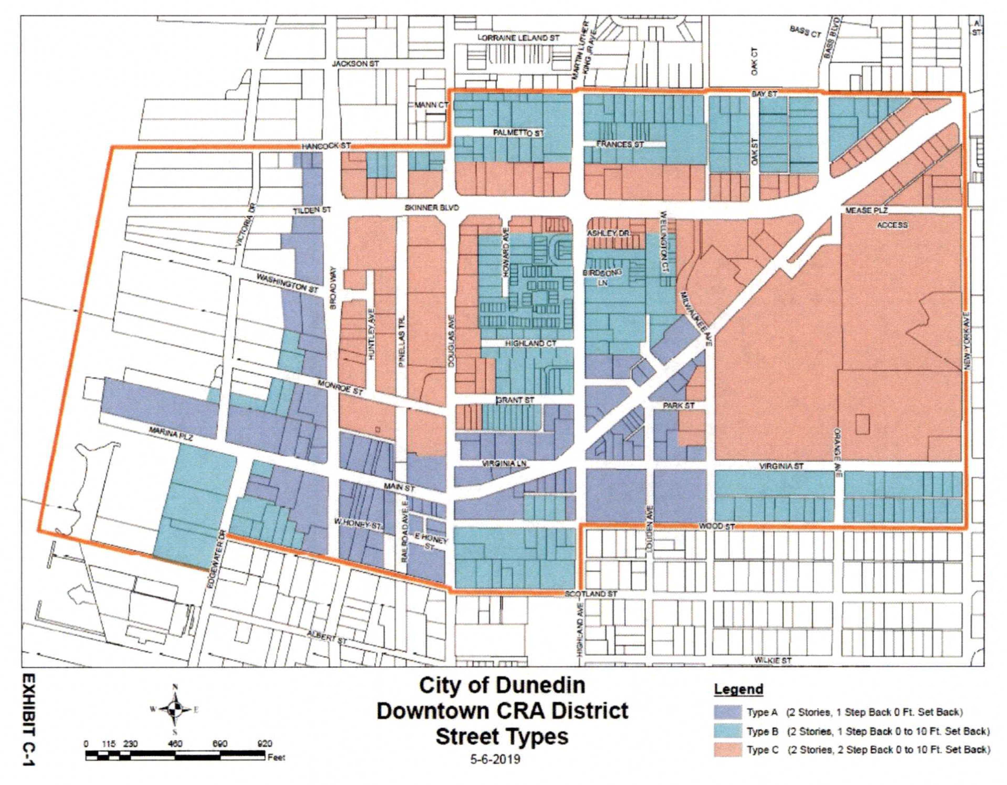 In keeping with the design based approach to limiting heights within the Downtown CRA district, three distinct street types, listed herein as "A" streets, "B" streets and "C" streets, are established to help perpetuate consistent height-to-width relationships for all new development or redevelopment. As such, new construction and/or redevelopment of all parcels located within the CRA district Boundary, as identified in Exhibit C-1 and designated DC, DR, MF-15 and MF 7.5 shall conform to the additional criteria as listed in § 103-40.4.1 through § 103-40.4.3.