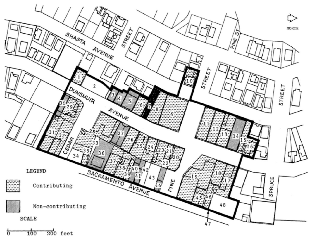 Dunsmuir Historic Commercial District. There is hereby designated pursuant to the provisions of this chapter, a historic district known as the "Dunsmuir Historic Commercial District." Said district is a composite of approximately four blocks that comprise the historic commercial core of the city, and which are roughly bounded by Sacramento Avenue, Dunsmuir Avenue, Pine Street, and Cedar Street. The "Dunsmuir Historic Commercial District," and the contributing and non-contributing resources within it, are shown in Figure 17.68-1.