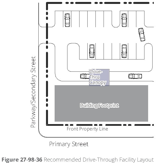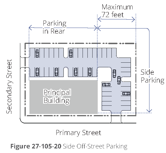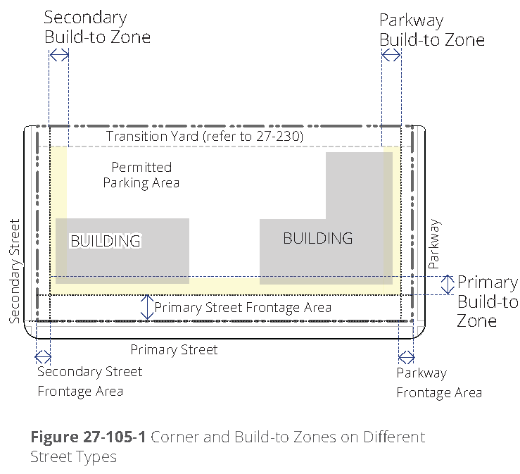 Corner lots. On corner lots, minimum requirements governing the percent of building façade that must be located in the build-to zone may be reduced by 60 percent along one of the frontages, at the property owner's option, provided that a building façade must be placed in the build-to zone for the first 30 feet along each street extending from the corner (refer to figure 27-107D-1).