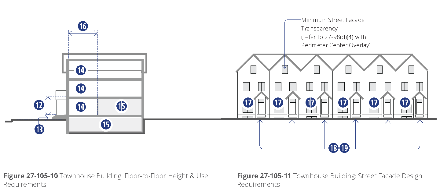 Intent. The townhouse building is typically comprised of several multi-story attached house units, located adjacent to each other, each with its own pedestrian entrance to the street.