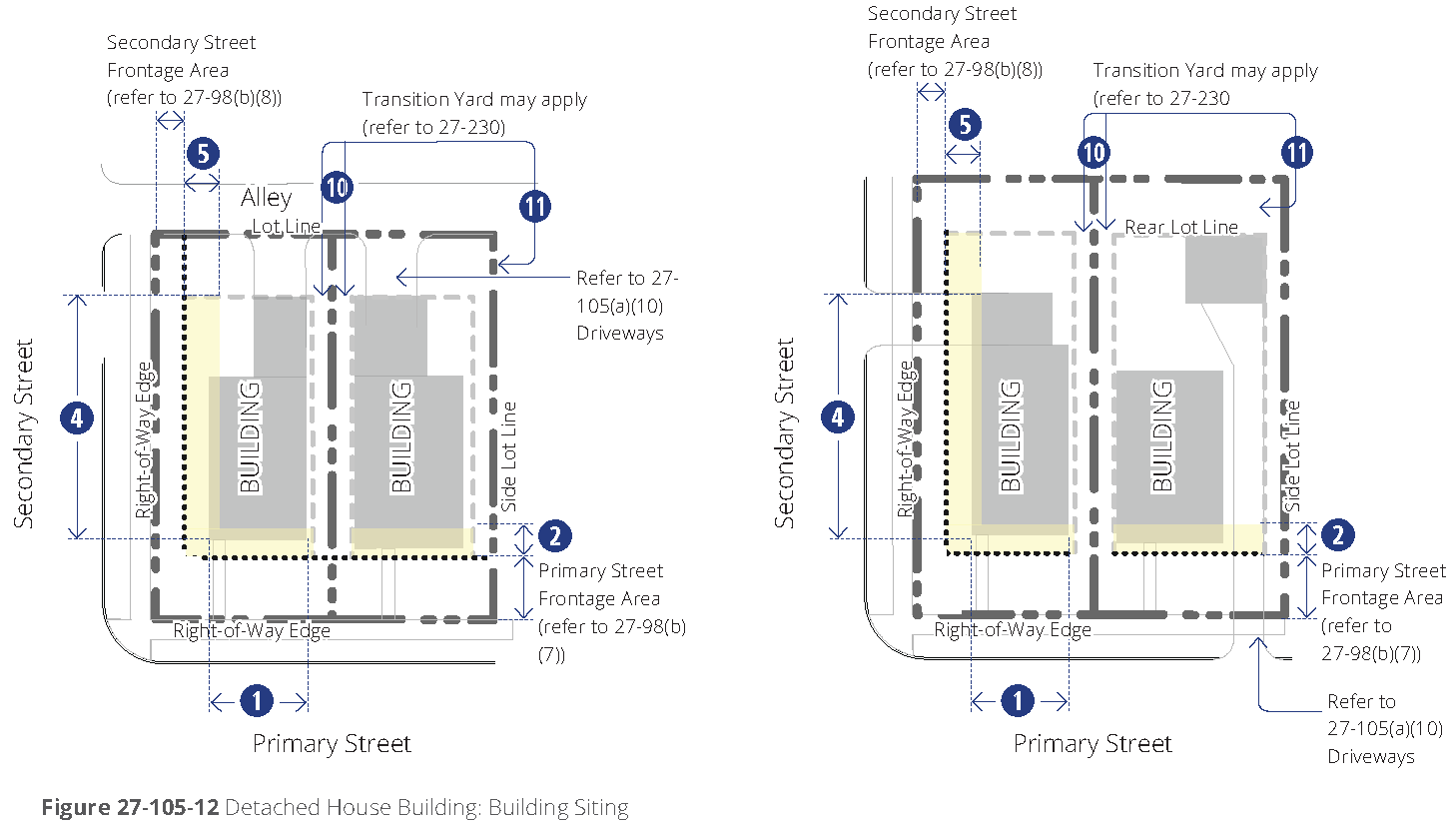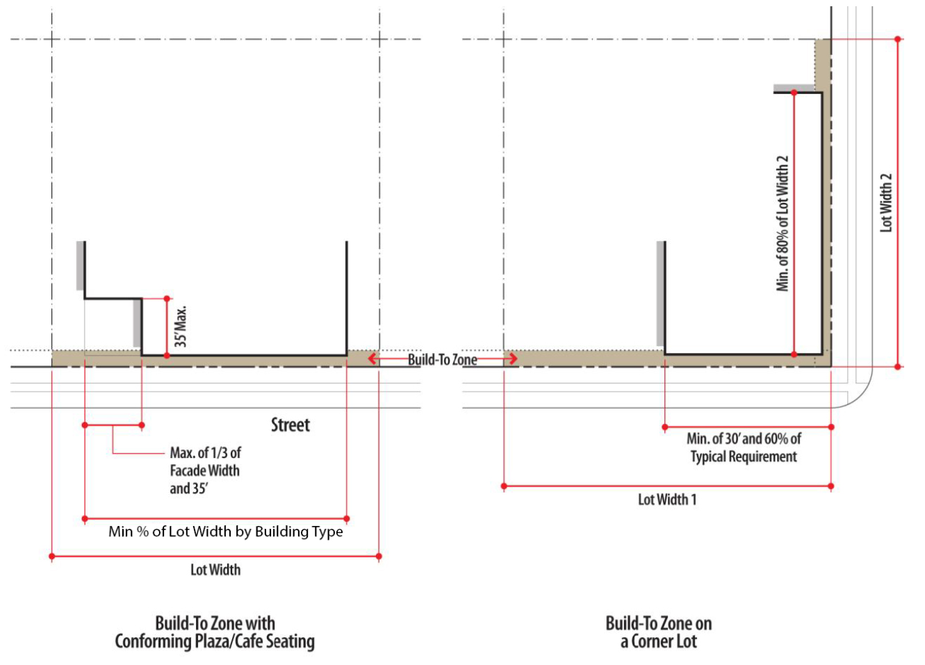 Figure 27-107D-1 Build-to zone with allowed plaza (left) and on corner lot (right)