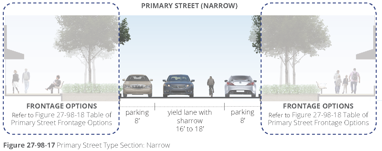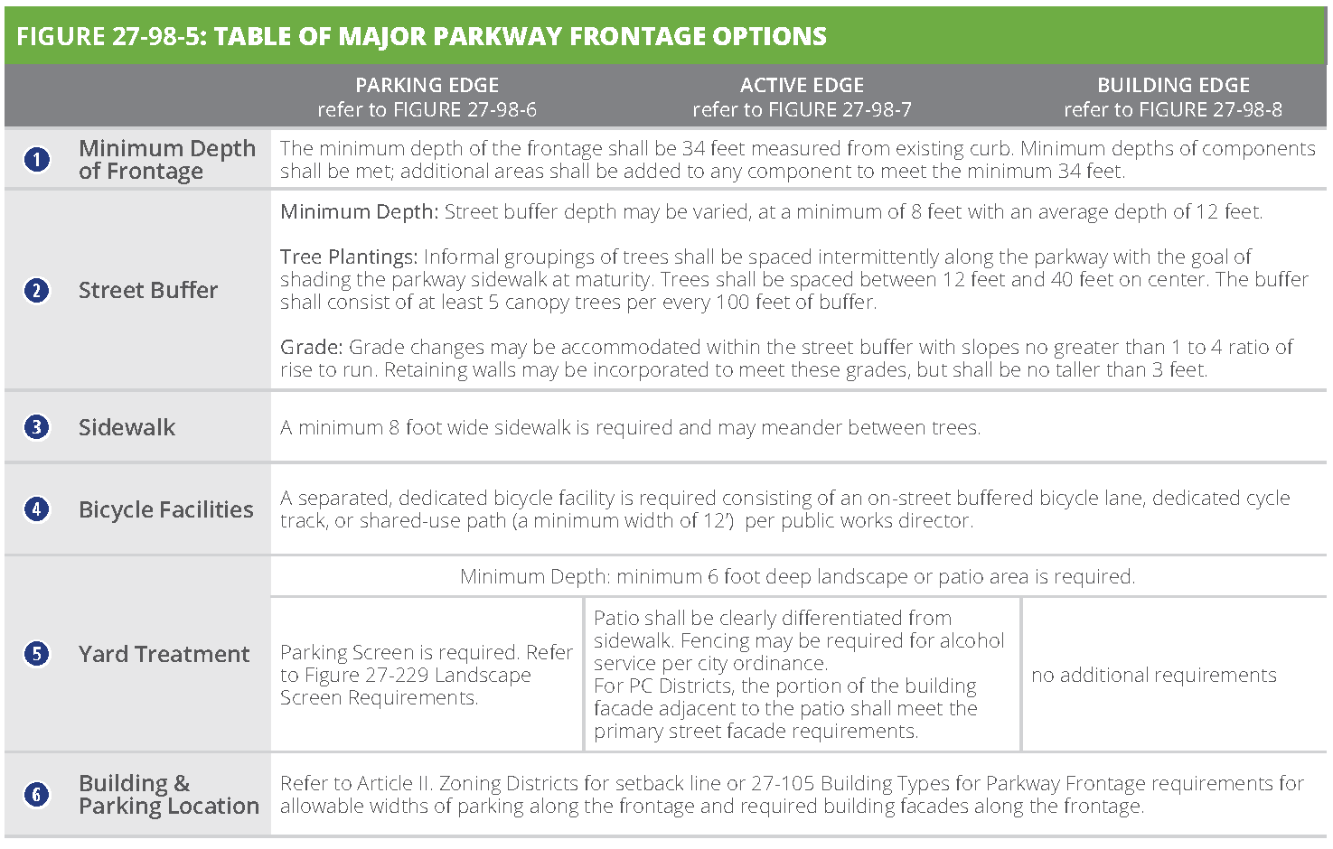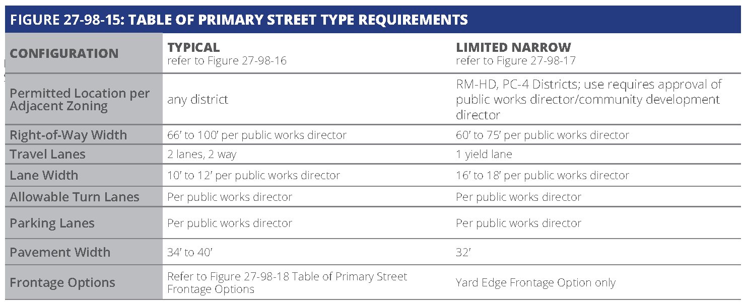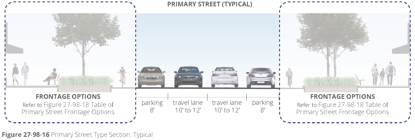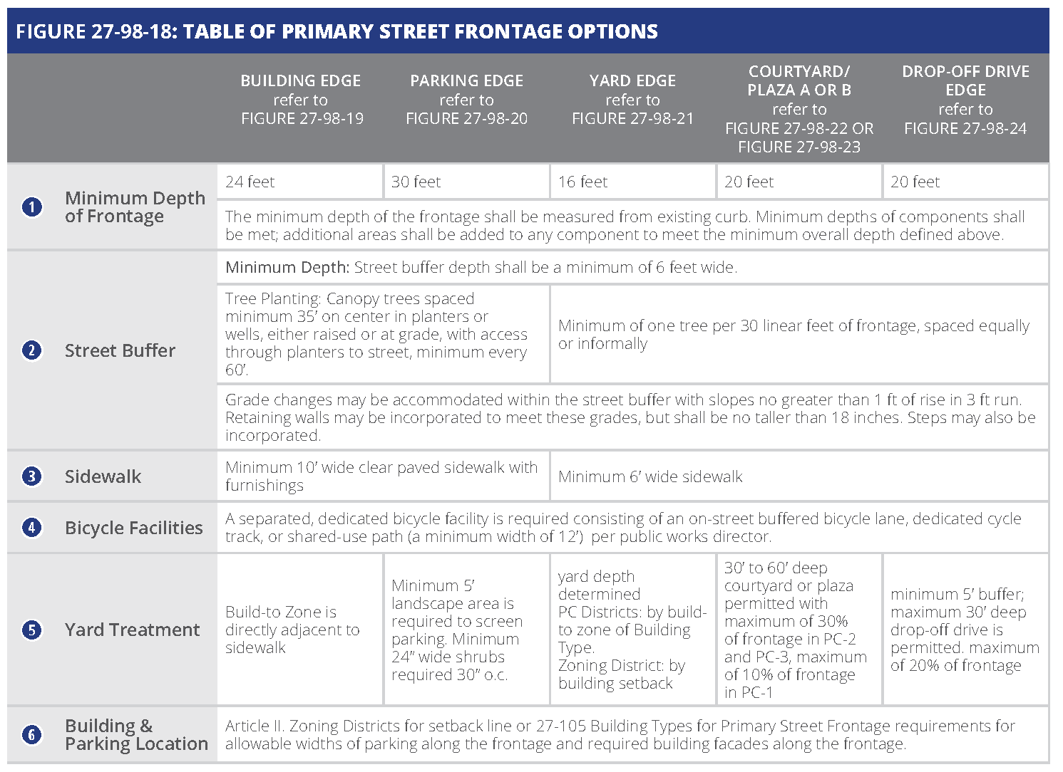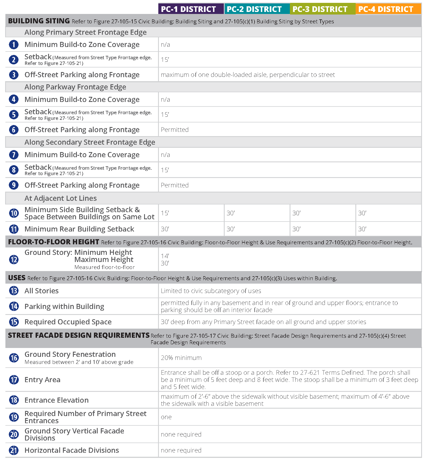 Street façade design requirements. The following explains the line item requirements for each building type within the section entitled "street façade requirements". These requirements apply only to façades facing public or private streets and façades facing main parking lots where visitors or customers park.