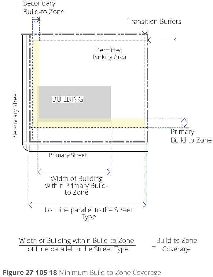 The percent of building façade in build-to zone specifies the amount of the front building façade that must be located in the build-to zone, based on the width of the street-facing building façade divided by the width of the lot. The build-to zone is measured from the edge of the street frontage area onto the site. The lot width shall exclude any portions of the lot used for required transitions, provided new streets, or provided open space.