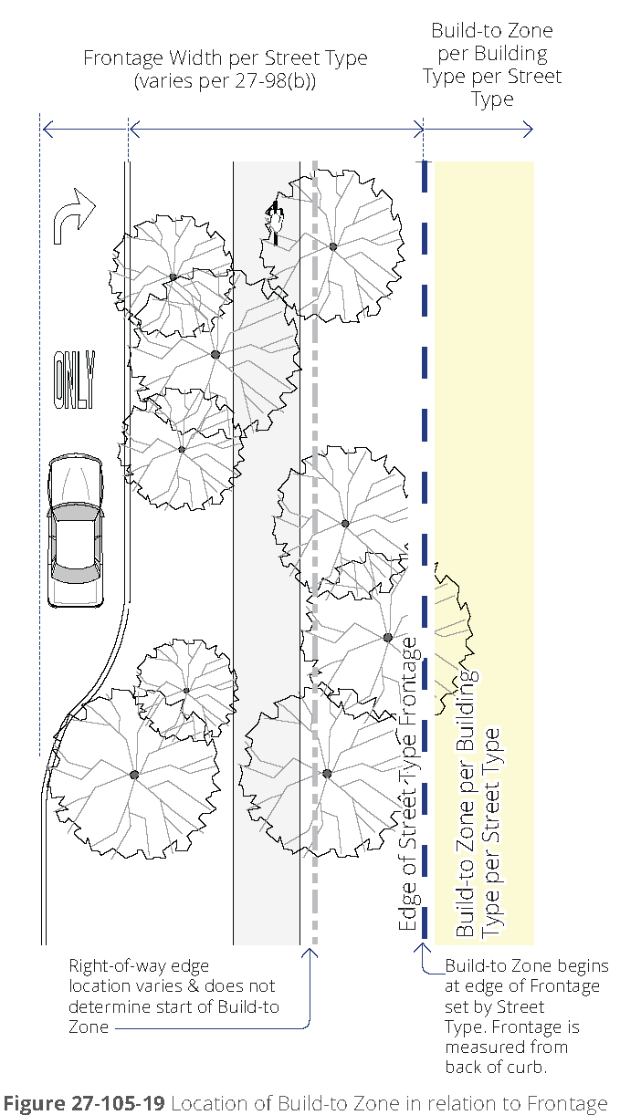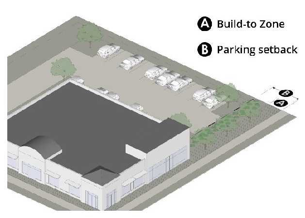 Defined. The build-to zone is the area on the lot where a certain percentage of the front building façade must be located, measured as a minimum and maximum yard (setback) range from the edge of the right-of-way.