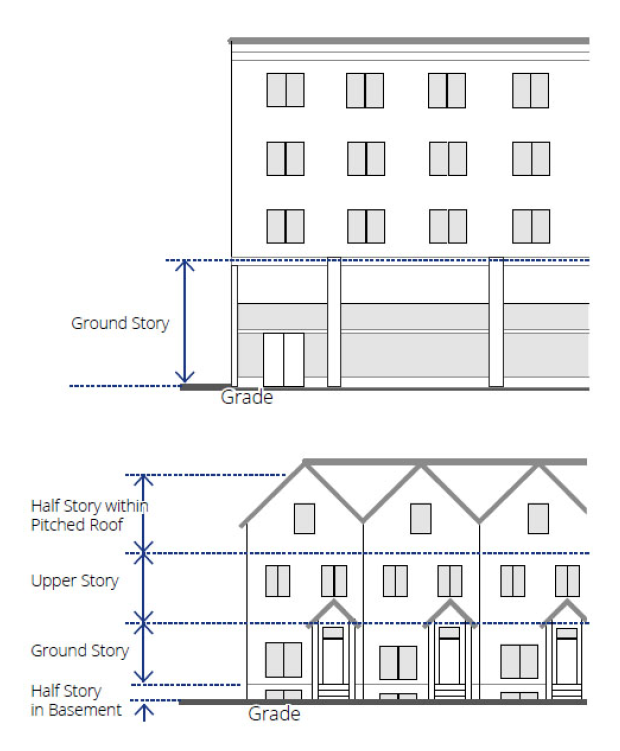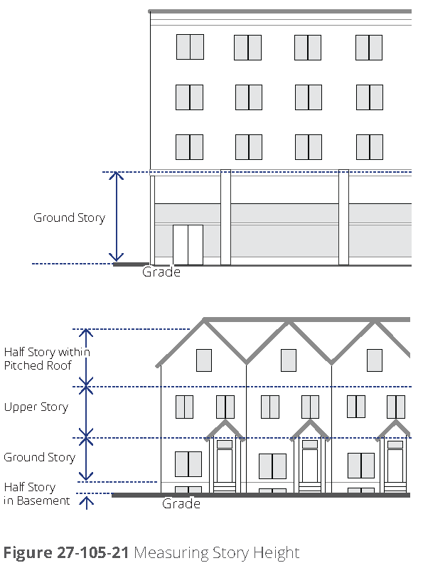 Ground story, minimum and maximum height. (Refer to figure 27-107D-2, measuring story height). Each building type provides a permitted range of height in feet for the ground story of the building.
