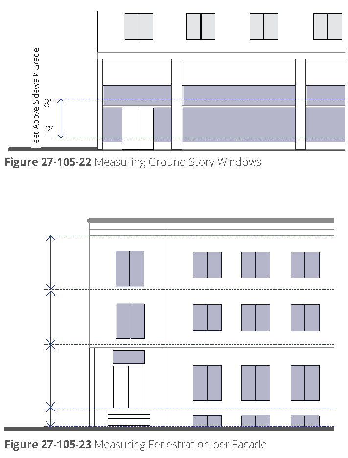 Minimum fenestration. (refer to figure 27-107D-4, measuring fenestration, per façade). Fenestration shall be measured as the percentage of the total façade area of each story dedicated to glazing. The following articulates the minimum amount of ground story transparent glass required on all façades facing streets.