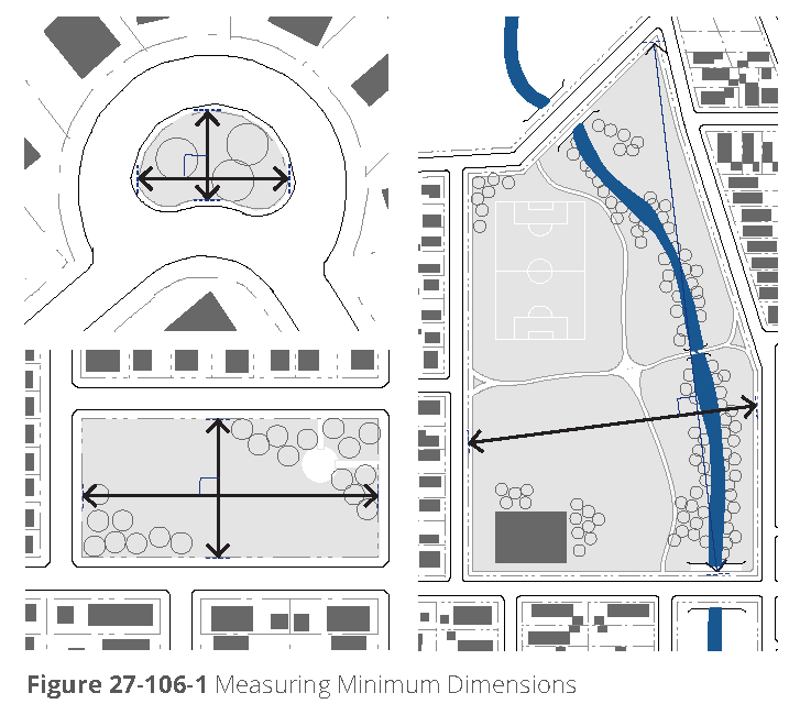 Minimum dimension. The minimum dimension shall be the minimum length or width of the open space, as measured along the longest two straight lines intersecting at a right angle which define the maximum length and width of the lot. Refer to figure 27-107E-1, measuring minimum dimensions.