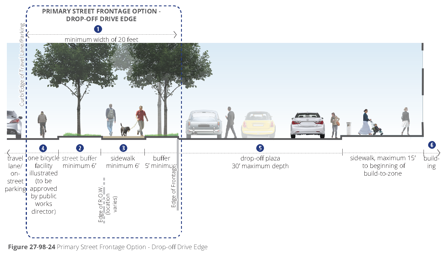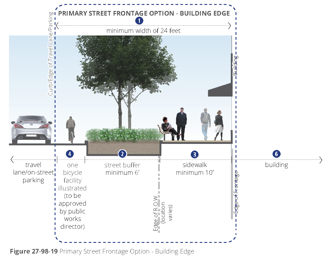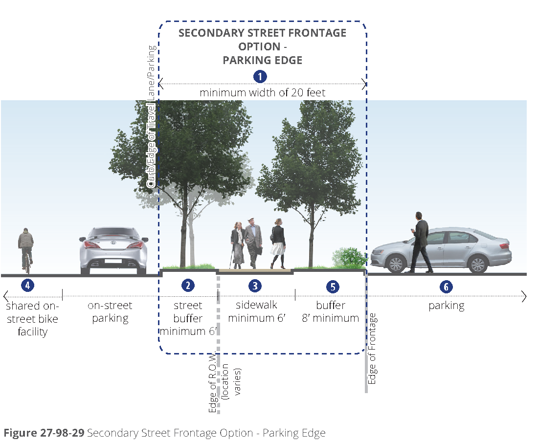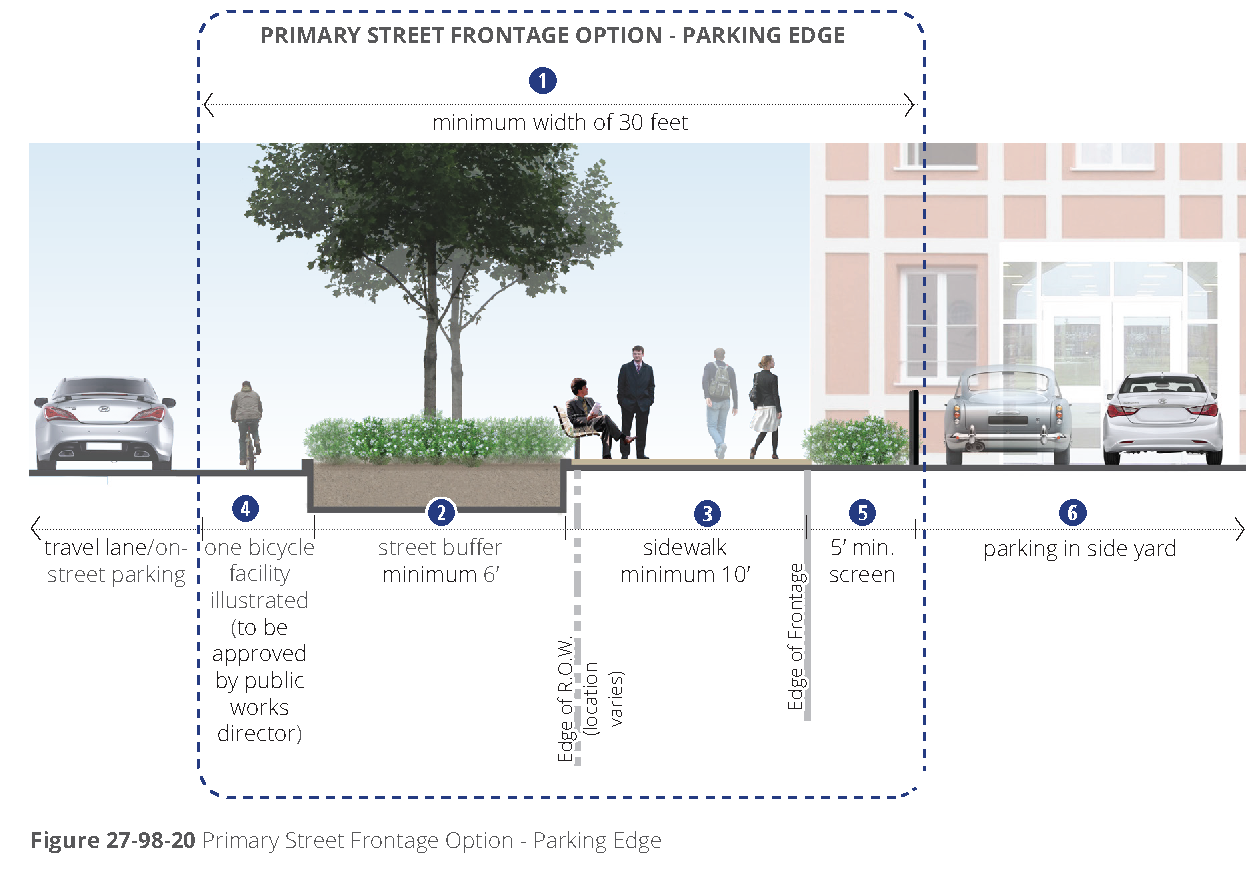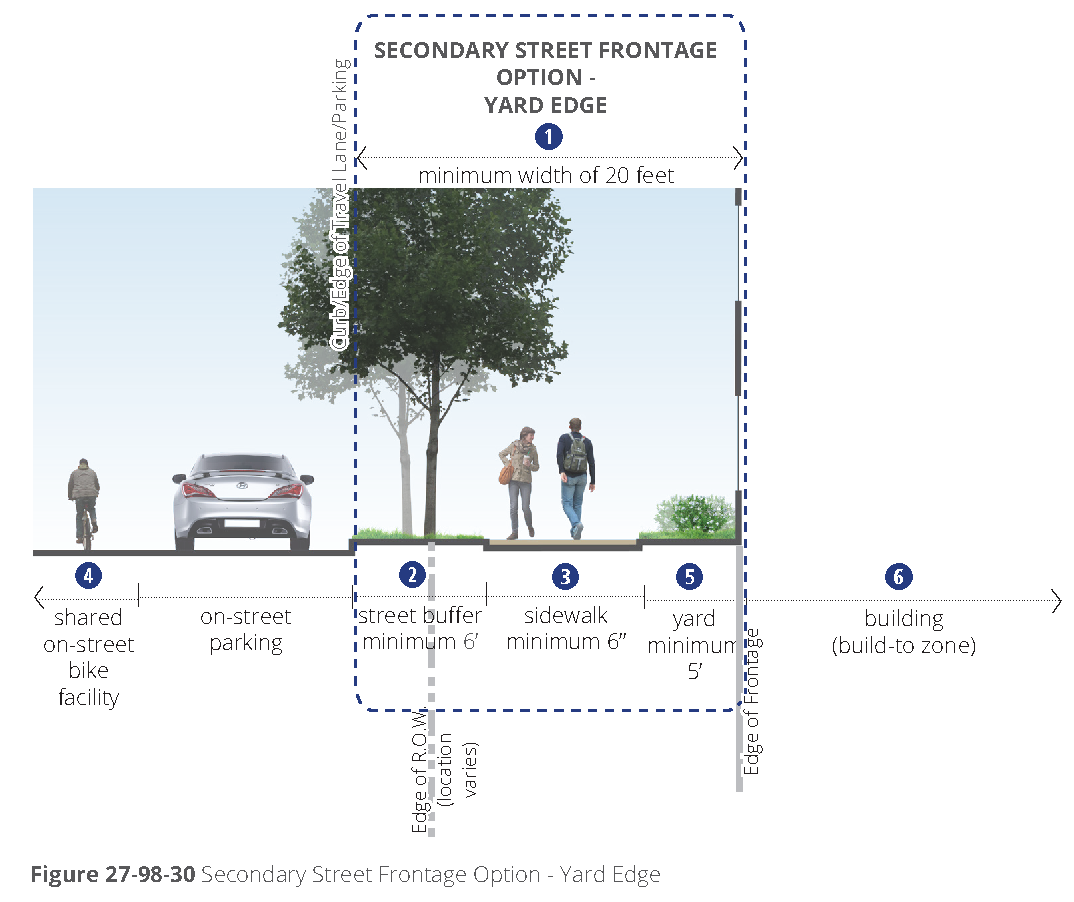 [6] Street-facing garage façades must be setback at least 20 feet from back of curb or back of sidewalk, whichever is greater.