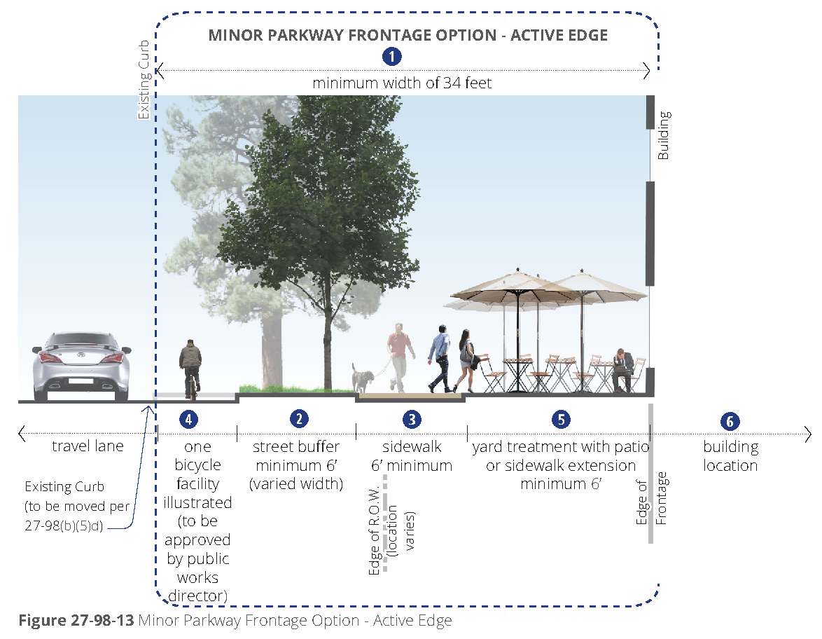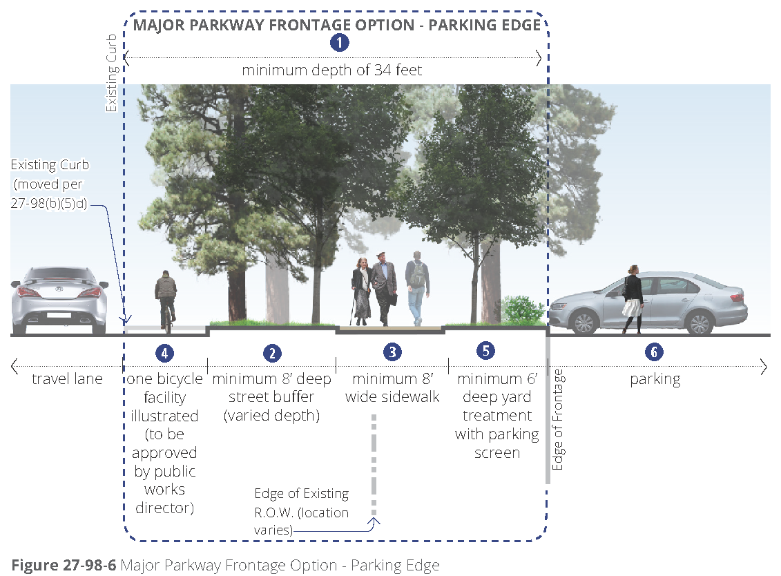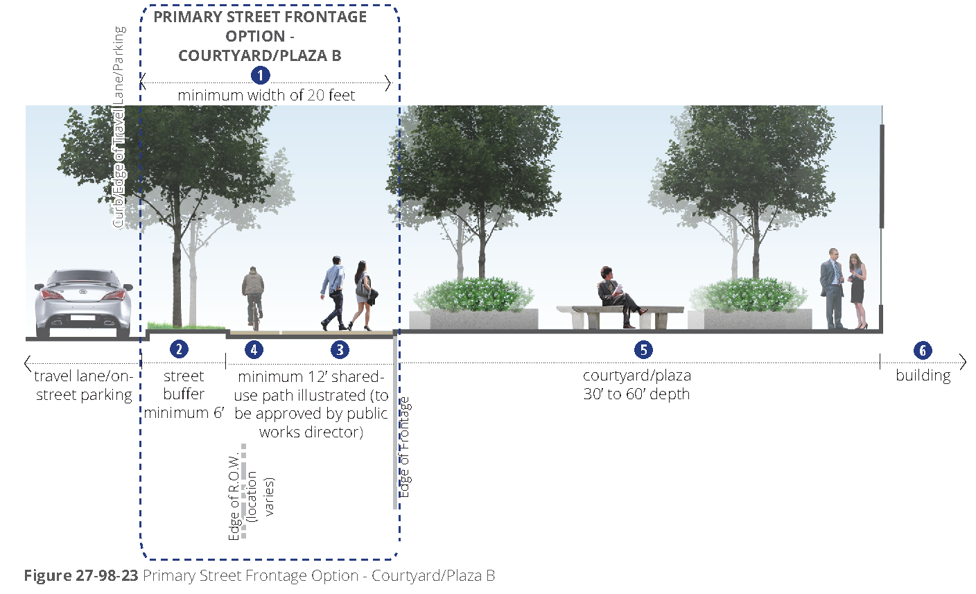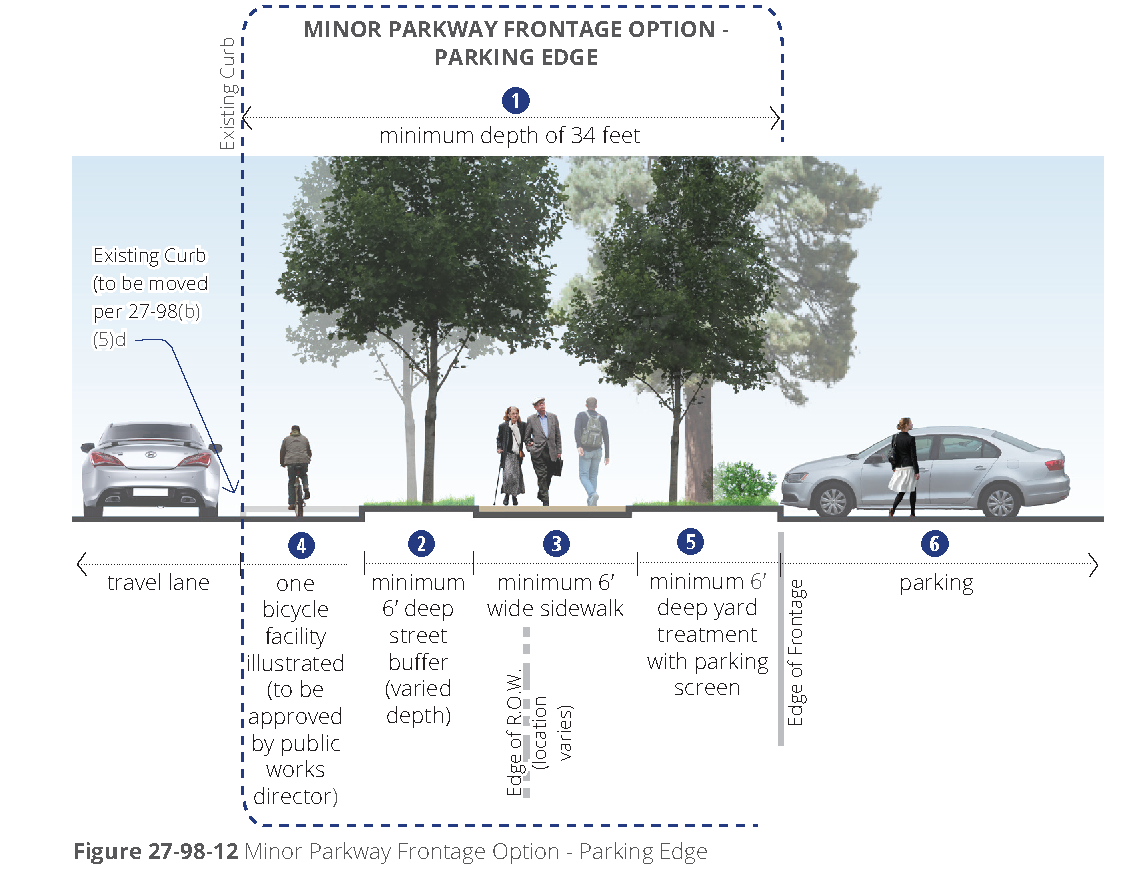 [6] Street-facing garage façades must be setback at least 20 feet from back of curb or back of sidewalk, whichever is greater.