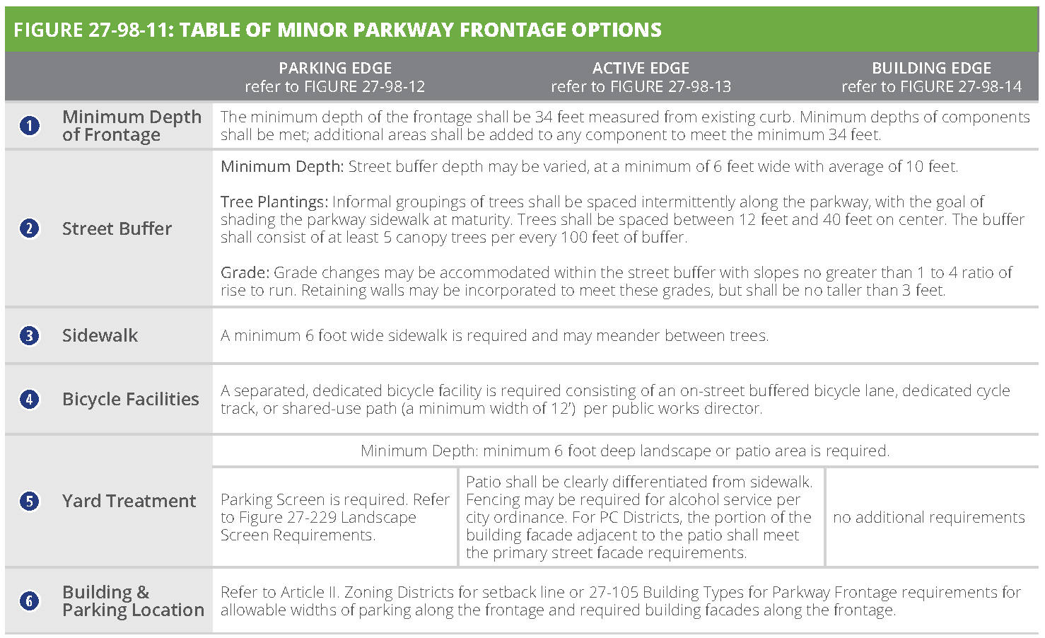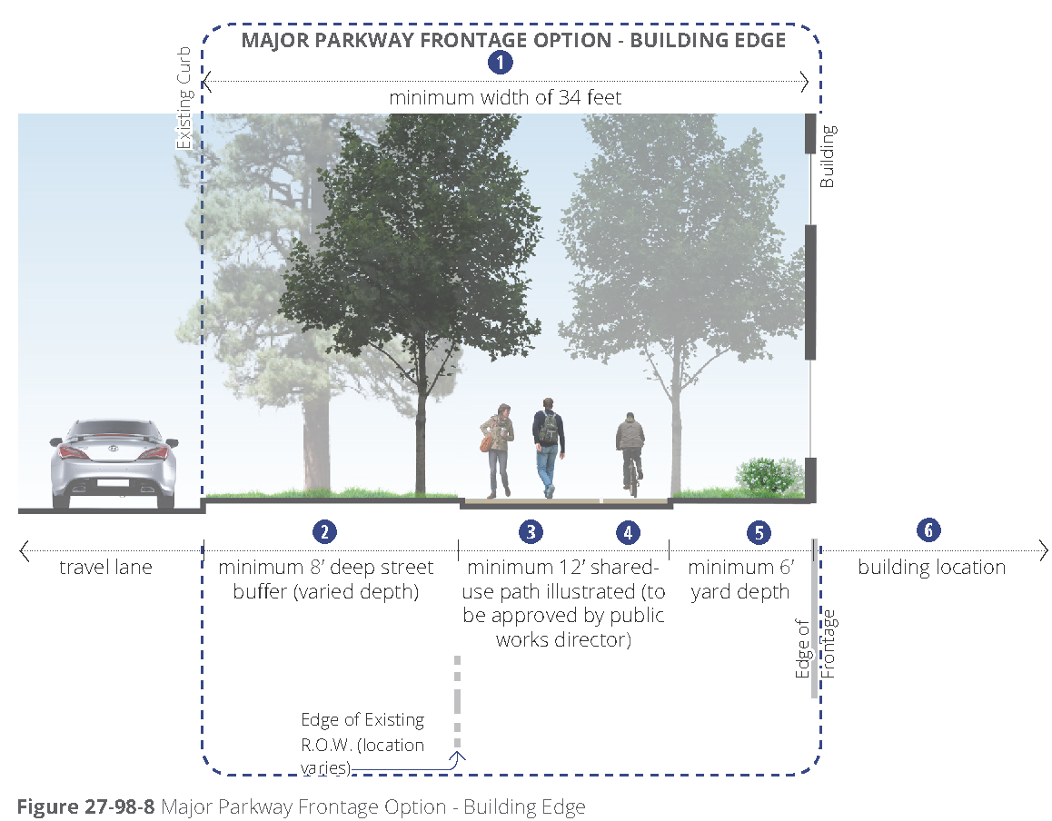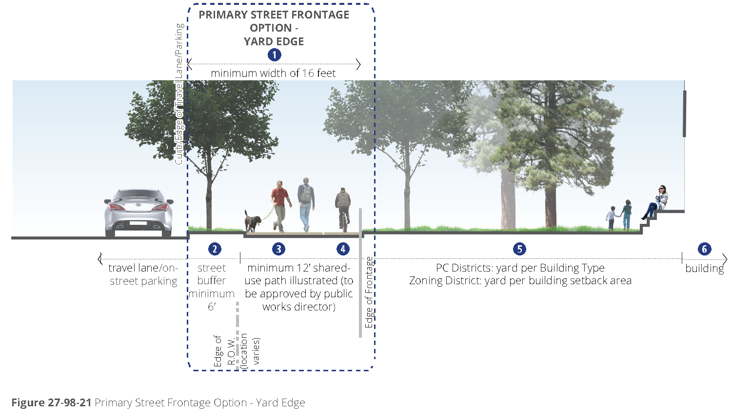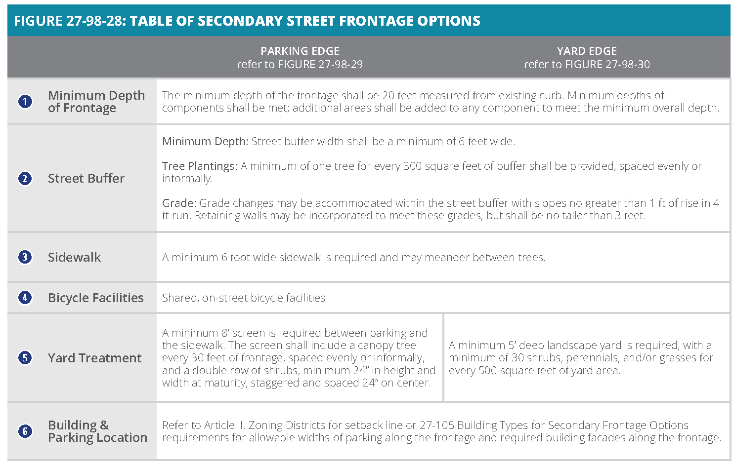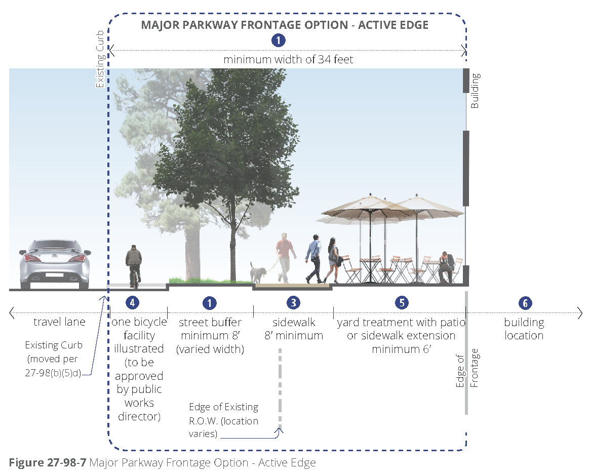 [6] Street-facing garage façades must be setback at least 20 feet from back of curb or back of sidewalk, whichever is greater.