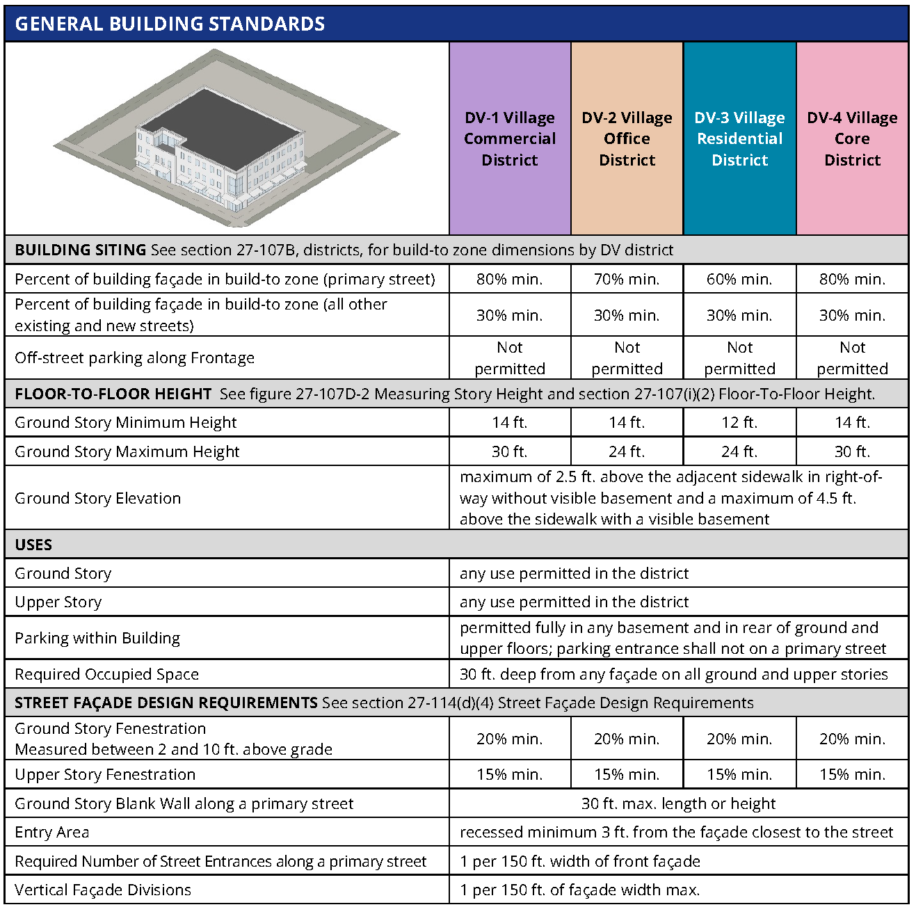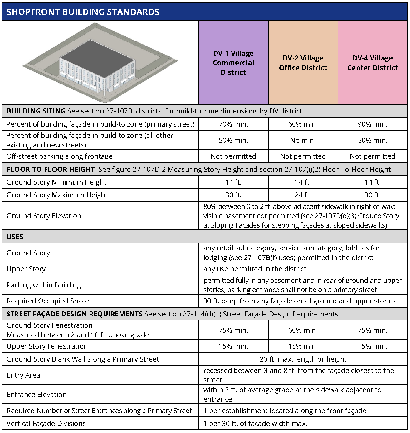 Uses within building. The following explains the line item requirements for each building type table within the section entitled "Uses within building." Refer to section 27-107B(f) uses for uses permitted within each DV district. The requirements in this section of the building type tables may limit those uses within a specific building type.