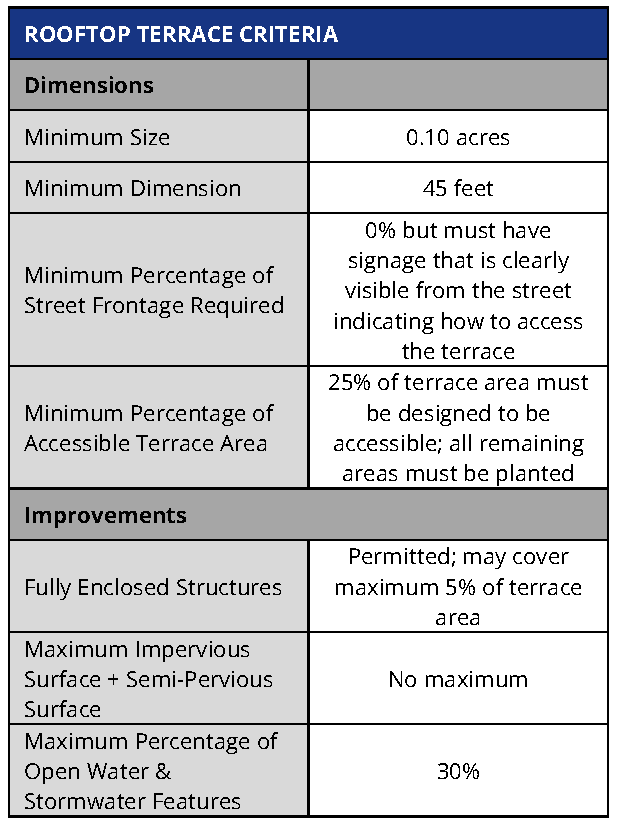 Rooftop terrace. The intent of the rooftop terrace is to provide a formal or informal, small to medium scale space for passive or active recreation or gatherings. Rooftop terraces tend to serve adjacent building occupants but must be open to the general public to count toward the open space requirement.