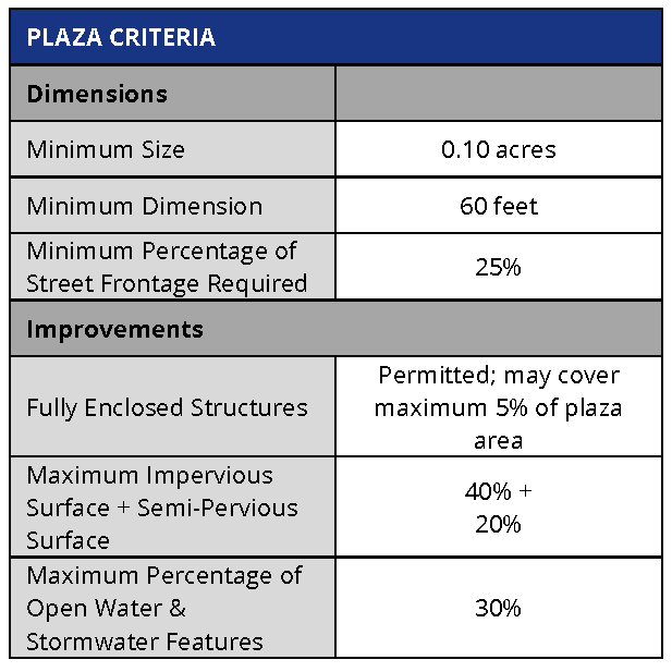 Plaza. The intent of the plaza is to provide a formal open space type of medium scale to serve as a gathering place for civic, social, and commercial purposes. The plaza may contain a greater amount of impervious coverage than any other open space type. Special features, such as fountains and public art installations, are encouraged.