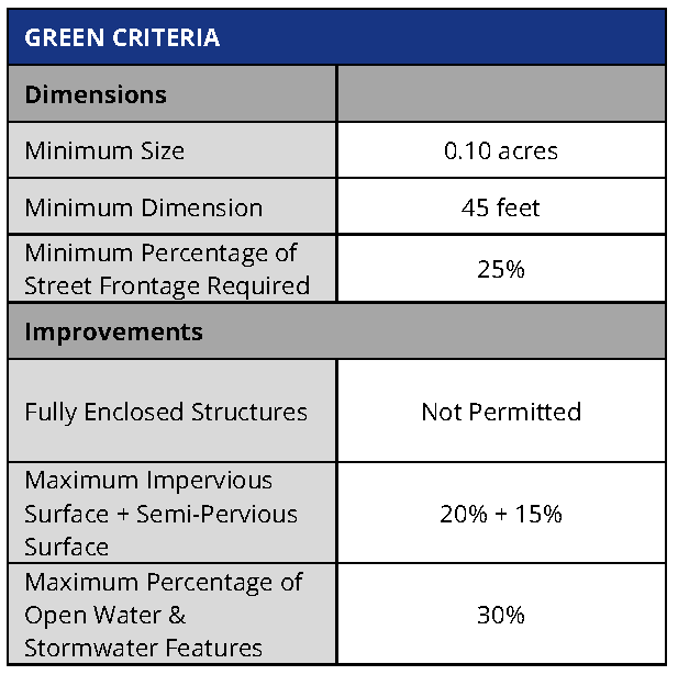 Green. The intent of the green is to provide informal, medium scale active or passive recreation for building occupants and visitors within walking distance, mainly fronted by streets.