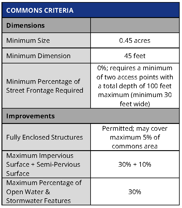 Commons. The intent of the commons is to provide an informal, small to medium scale space for active or passive recreation for a limited area. Commons are typically internal to a block and tend to serve adjacent building occupants.