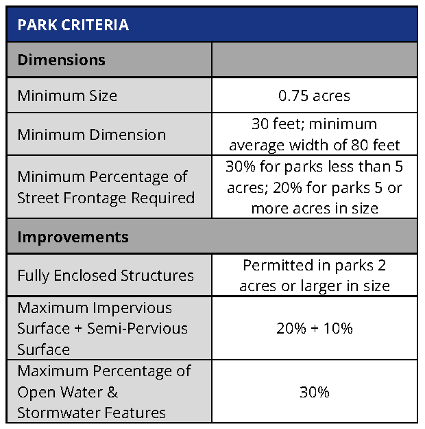Park. The intent of the park is to provide informal active and passive large-scale recreational amenities to local residents and the greater region. Parks have primarily natural plantings and are frequently created around an existing natural feature such as a water body or stands of trees.
