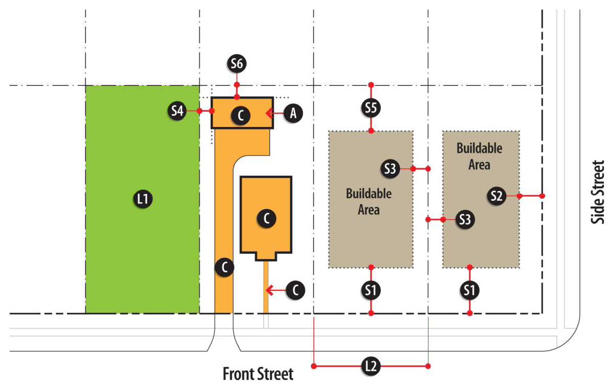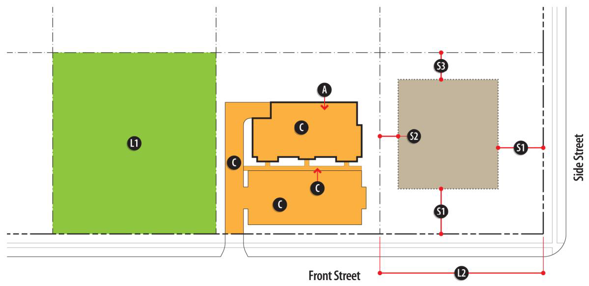 When a lot contains multiple buildings, the build-to zone requirements are measured as the sum of all buildings. There are no build-to zone requirements when a building is located behind another building that conforms to build-to zone requirements.
