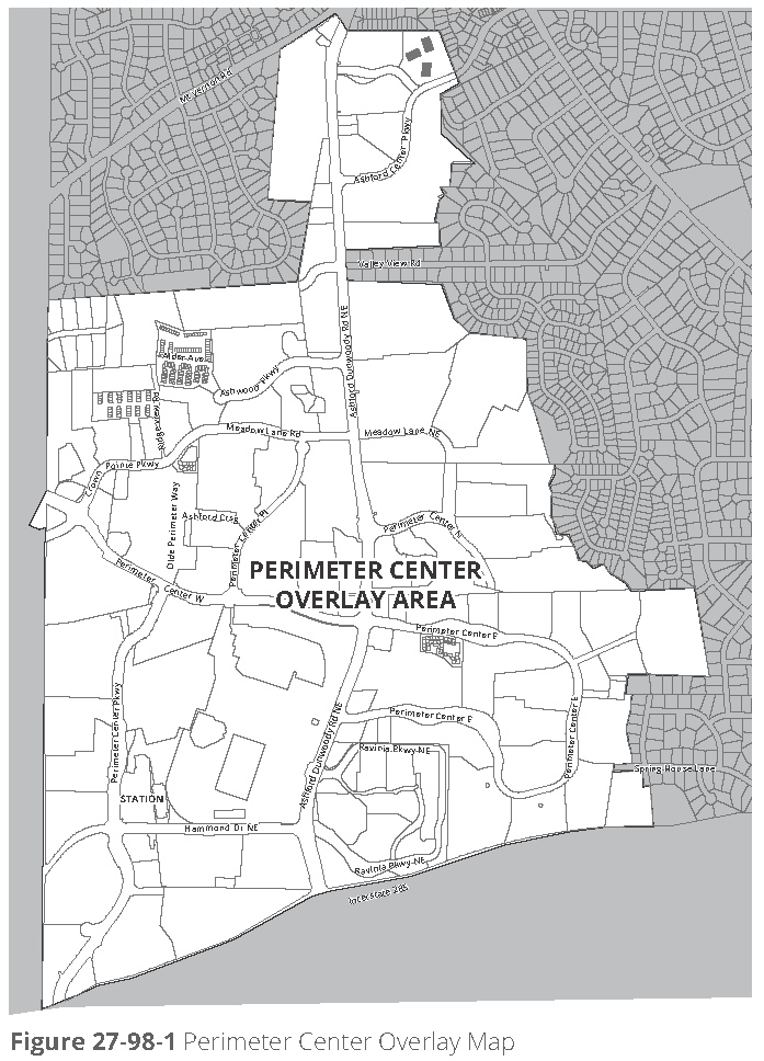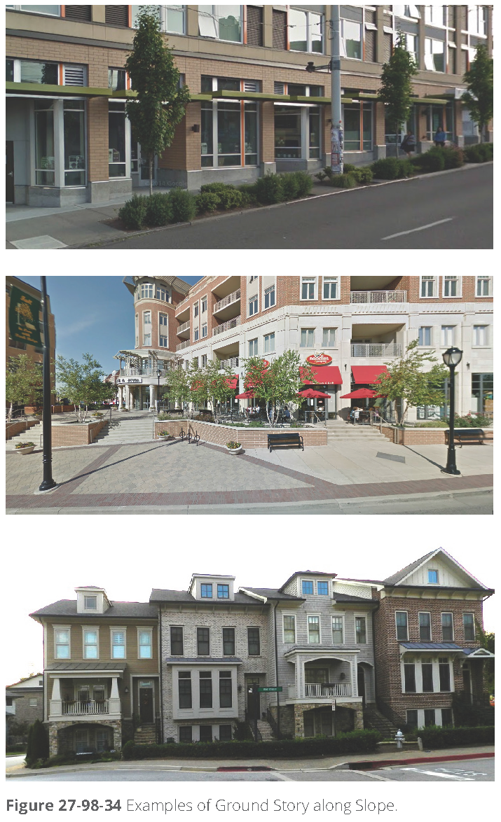 Intent. Given the topography in many parts of Dunwoody Village, building design must accommodate grade changes along the sidewalk without creating tall, out-of-scale blank walls. Large, unarticulated building façades signal to pedestrians that an area is not intended for walking, reducing activity in the area and creating dead zones.