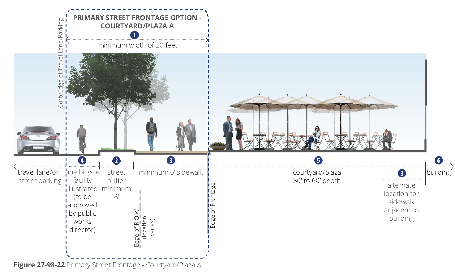 Courtyards. Courtyards, per section 27-621, terms defined, located along the façade in the build-to zone count towards the minimum coverage. Refer to street types for limitations of courtyards along some frontages.