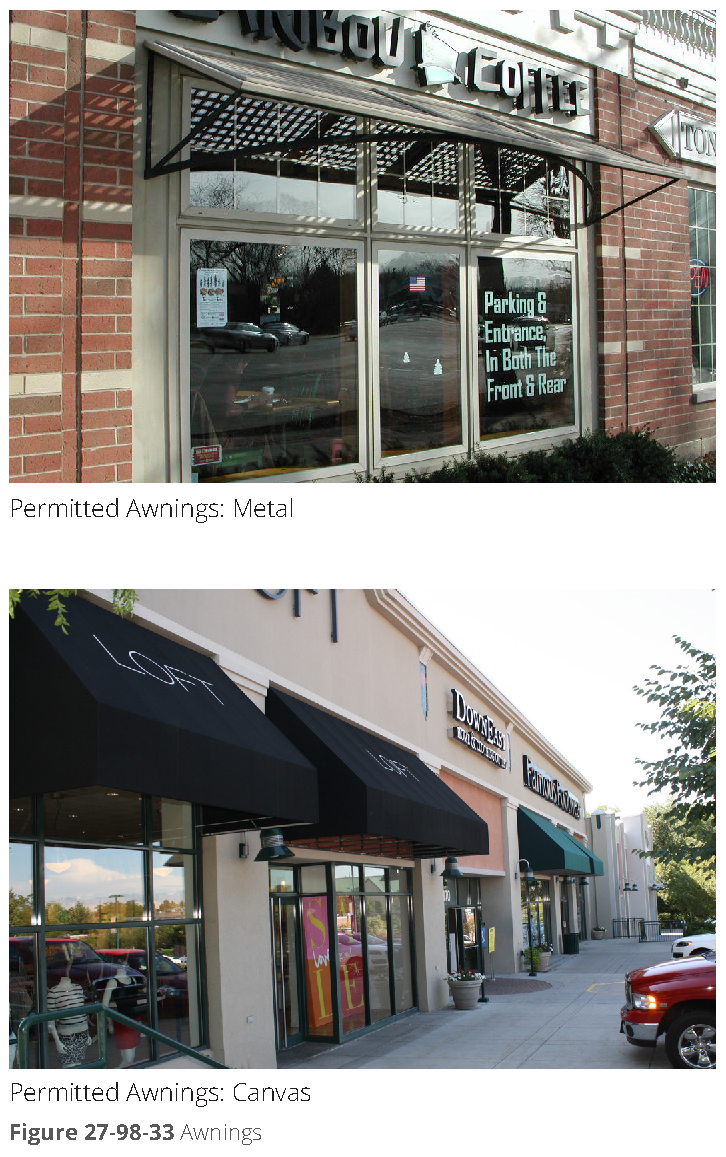 Awnings. All awnings must be canvas, glass, or metal. Plastic awnings are prohibited. Canvas and metal awnings may not be translucent.