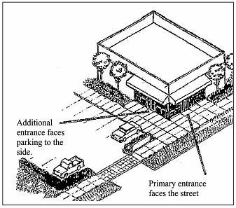 Focusing an entrance toward a parking lot without also addressing the street is not recommended.