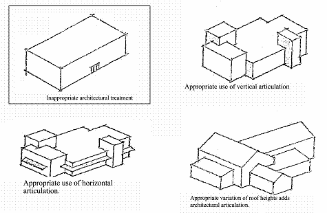 For all buildings, divide the building(s) into modules that express traditional dimensions. In general, a primary facade plane should not exceed seventy-five feet in length. If a building would exceed this dimension, provide a jog in the facade to divide it into subordinate elements that will be less than seventy-five feet in length each (the jog should be a minimum of twenty percent of the facade plane height).