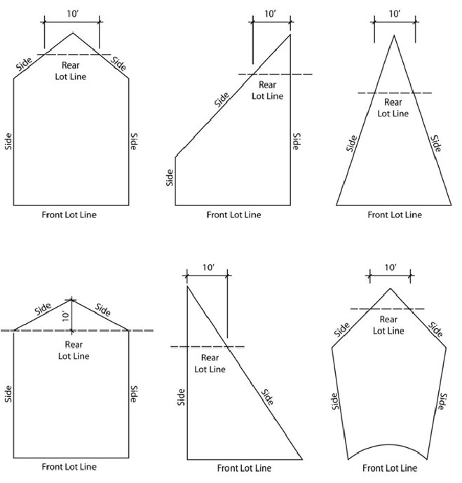 General. The distance/depth of a setback area (i.e., front, side, or rear) shall be measured at right angles from the nearest property line establishing a setback area line parallel to that property line.