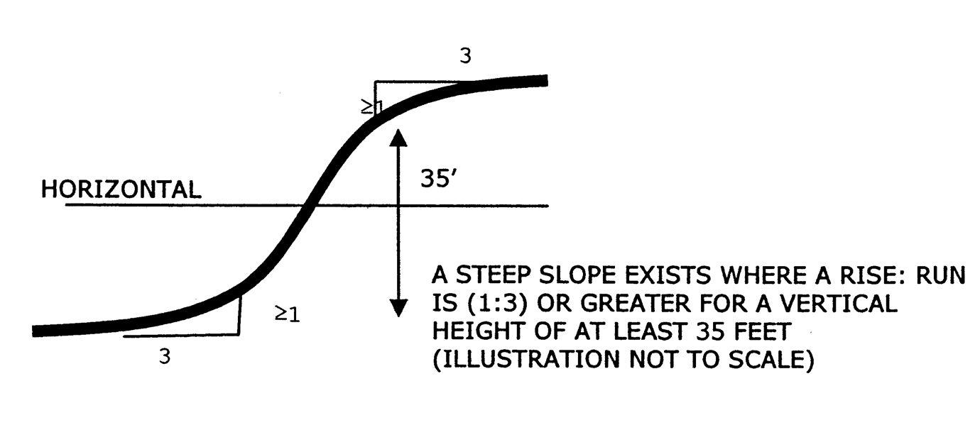 Steep slope means land with a slope which equals or exceeds a vertical rise of one foot for a horizontal run of three feet for a vertical height of 35 feet or more.