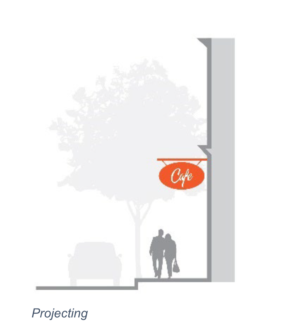 Projecting sign. Any sign, generally doubled-faced, affixed to a building or wall in such a manner that it extends more than 12 inches from the wall.